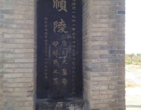 唐顺陵是武则天之母杨氏的陵墓,在咸阳市东北18千米的陈家村南。陵园有内城和外城。内城也叫皇城,为方形,四角夯土墙尚存。内城南门二土阙,间距20米,陵底部平面呈方形,边长48.5米,陵高12.6米。墓道绘有壁画...