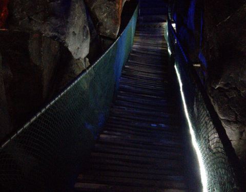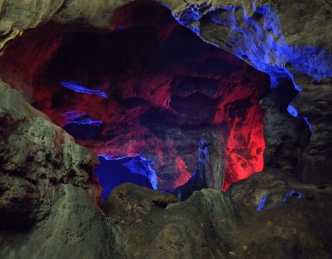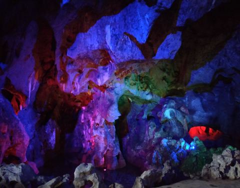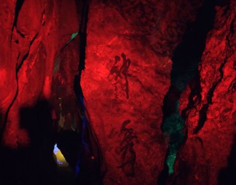 走入溶洞内,发现景观和以往去过的那些溶洞真的大不相同。石钟乳也有,但是很少,几乎都是太湖石的天下——这太湖 石,可不是园林中看到的那种用来堆砌的小块石头,而是极其巨大的天然的石头。石头造型奇特,中间有一个个大小不同的孔洞,在五彩灯光照射下显得光怪陆离,如梦似幻。最震撼人心的是那一条条狭窄深邃的峡谷,如飞天峡,宽仅1米左右,高处则渐渐合拢,暗不可见。