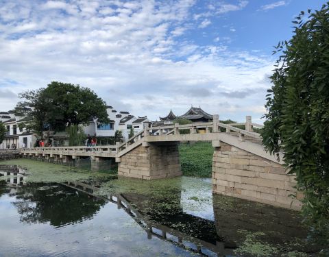 陈妃水冢是锦溪古镇主要景点之一。南宋建都临安时,宋孝宗的宠妃陈妃病殁水葬于此,锦溪便改名陈墓,长达880年。1993年,恢复锦溪古名。我们从十眼桥走过去,看见水冢周边长满了水生植物,完全没有水中的感觉。本来是有一段栈桥可以走近一些的,但栈桥破损禁止通行了,只能远观了。看古莲桥也可以看到右后方的陈妃水冢。