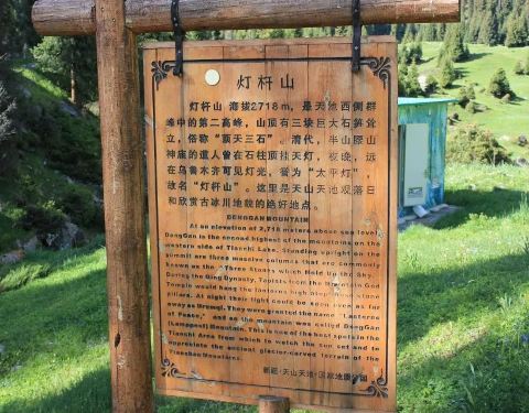 灯杆山,位置就在天池西岸大约4公里的地方,他的主峰海拔高达2700多米,顶峰有3大块巨大的石笋,其状如同戟,据称为,顶天三石。神话中,王母降妖伏魔后,她的绣花鞋化生成这个山。天池观落日最厉害的去处。春天时、满山绿色,景色很漂亮,值得去。