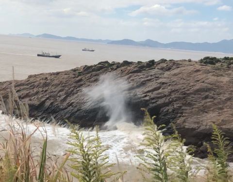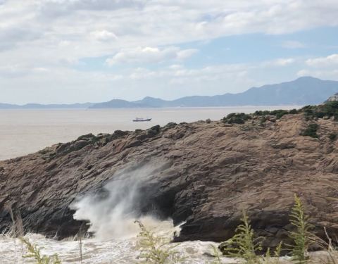 朱家尖大青山凭海临风,喷水洞特殊的结构不但使得浪潮涌入的时候发出巨响,还可以从洞顶像喷泉一样喷出几十米高的水柱,非常神奇。