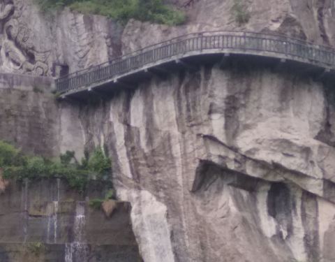 双林石窟里面有几个景点组成,包括明镜湖,双林叠瀑,空中栈道,卧佛店等,比较感兴趣的是前几个,尤其是瀑布和空中栈道。站在瀑布前的广场上,可以看到瀑布在石壁上飞流而下,水花四溅,同时可以看到在崖壁上狭窄的栈道,我胆子大,所以沿着石壁上窄窄的石道爬上去,由于有瀑布,路也是湿的,然后行走于栈道,就在悬崖上居高临下,俯瞰整个大佛寺的风景,很不错