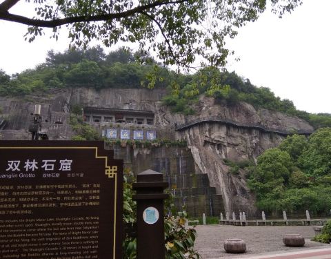 双林石窟是新昌大佛寺景区内新建没多久的一个景点,双林石窟利用原采石场的旧址在采石的半山腰中的石窟中雕刻了一些佛像,需爬上一个小坡才能看到的。
