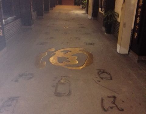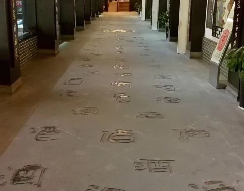 参观走廊地面上是泸州籍著名书法家倪为公先生所书“百酒图”,又叫“九九归一图”,以行、草书为主...