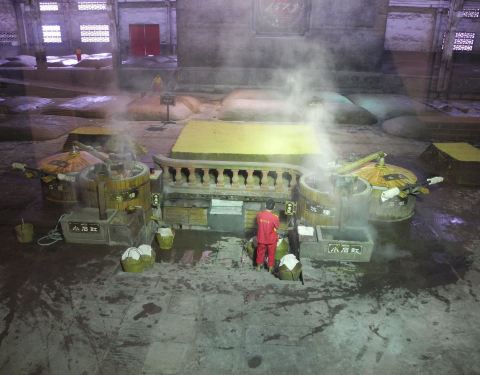营沟头在明清时期是一条弯弯曲曲通到长江边的幽深小巷,宽不过三米,两旁俱是青瓦白墙的酒家,均是前店后坊,舒聚源、温永盛、春和荣、鼎丰恒、鸿兴和、永兴诚……巷子尽头,就是泸州城的南门。出城门往下,便是长江边的铜码头,千坛万罐的美酒自此运往大江南北。白天,客商熙来攘往,热闹非凡;夜里,寂静的巷子里飘出阵阵浓郁的酒香。 现在,自明朝万历年间持续酿造至今从未间断的舒聚源(温永盛)槽坊已改建为1573国宝窖池群,成为全国重点文物保护单位,所以入内参观是要买票的。 参观走廊地面上是泸州籍著名书法家倪为公先生所书“百酒图”,又叫“九九归一图”,以行、草书为主,融楷、篆、隶于其中,99个书体各异的小“酒”字环绕在大“酒”字周围。隔着玻璃,可以看到整洁的酿堂、古朴的甑桶、碾过明朝小青砖的叽咕车,工人师傅们正在酿酒。