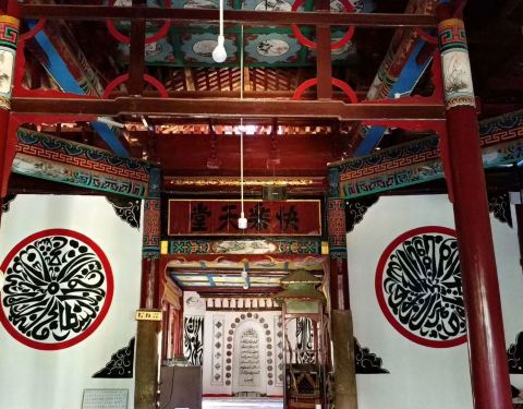 这里是一个免费参观的景点,平时可能还在开展信教的活动,这里只有一个院落,里面很清净,在大门口有一座唤醒楼,楼的前面有一个照壁,照壁的旁边有棵柳树,柳树的对面有拖姑清真寺的石碑,去的时候,有一个小朋友用手指着石碑,装作黑板,高声的教另外在柳树下的小朋友认字,一派烈阳绿柳蝉鸣急,顽童高声教书忙的景象。