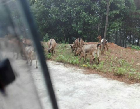 山里真的很凉快,越往谷里走越凉。去五老峰一定要去情人谷,话说能找到情人!回来的路上散养的山羊,小猪