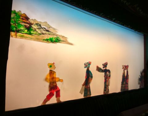 对于建筑前面的那些和江南有关的摆设不是很在意,直接奔向后面的皮影戏馆。 皮影戏的的表演时间是固定的,但是也要看游客多不多,三三两两的游客,后面的师傅也是不会表演的,还好我们是一堆人进去的。 表演的内容也无外乎一些经典的内容,比如西游记。一个师傅操作两个以上的皮影偶人,伴着音响节奏开始舞动袭来,偶然师傅还会吆喝两声,热闹极了。 皮影鲜艳的色彩,即便隔了一层幕布也一样鲜艳,很吸引小孩子的目光。