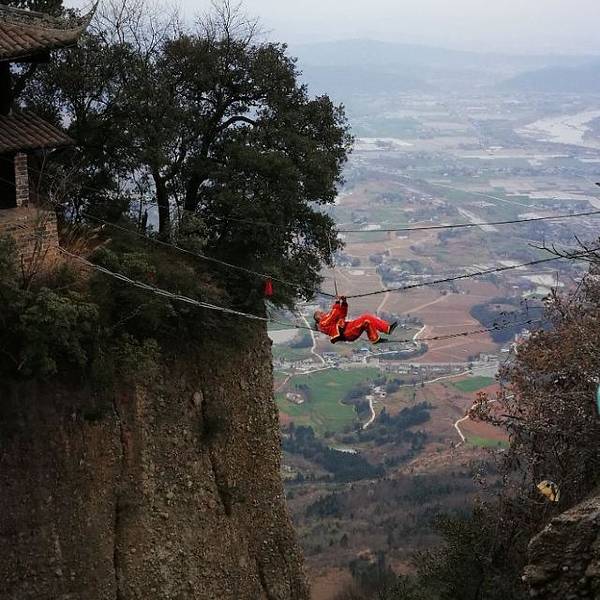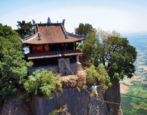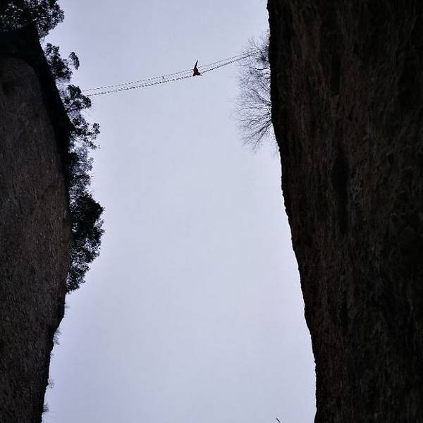 一座座山峰拔地而起,雄伟挺拔,山顶有刺激的走钢丝表演。