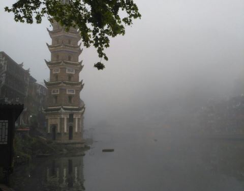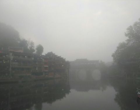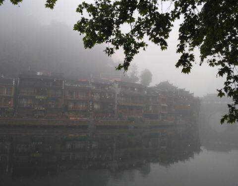 以为凤凰古镇是整体,还不知道此处另有別名沙湾在虹桥风雨楼另一边,江水於此做近90度大弯,順江而上,建筑没有另一側熱闹,沿路上行,一路都在新建,江中亦有泛舟之处,后天人工味較重,应为新扩建的,唯清晨薄雾,甚为优雅,漫步其中,多了分宁静,太好了。