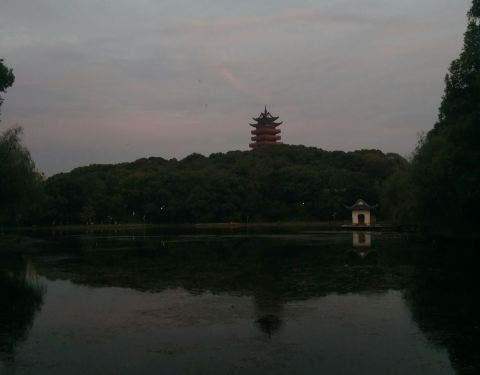 位于湘江旁边上的一处有小山小湖的城市公园,公园是免费开放的,晚上公园内的山上塔楼亮起来很漂亮