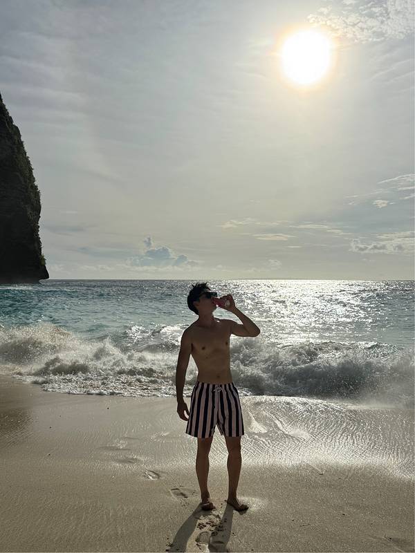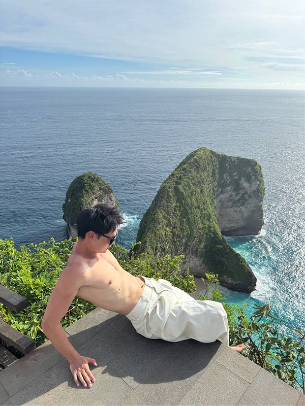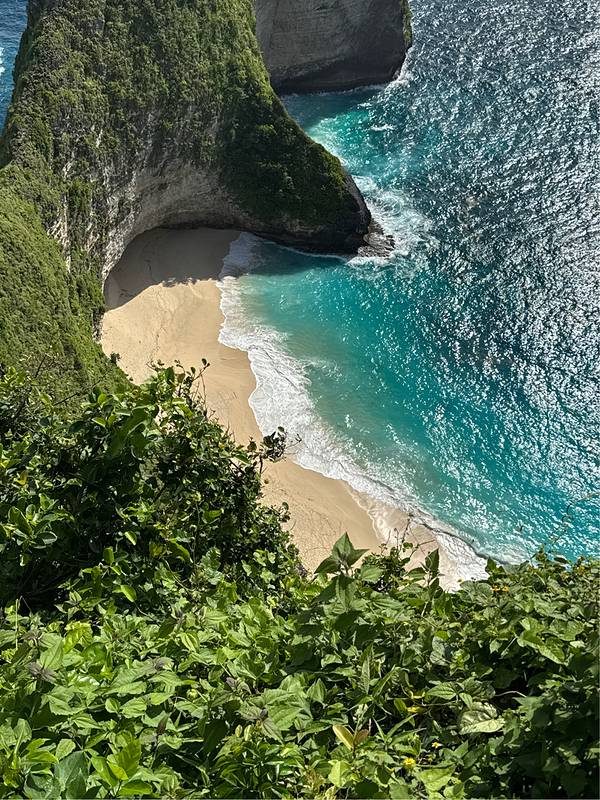 岛上有比较经典的三个景点,分别是精灵坠崖(Kelingking beach)、裂痕(broken beach)、天神浴池(Angle billabong)。精灵坠崖在山顶,越美的风景总在越高处,路也越难走,但当你看到眼前浩瀚无垠的大海时,你就突然释然了。其实人生也不过如此,只有站的更高,你才会发现上面的世界更精彩。坐在这拍照真的是需要勇气,浑身紧张的肌肉暴露了我的紧张。而且后面排队的人很多,简直就是排队十分钟,拍照一分钟的节奏。导游不停地狂按快门,然后嘴里一直说着好看好看好看,殊不知只是景好看而已......欧美人真的很会玩,会爬到树上拍照也会走到悬崖上。反正我是不敢爬,还有楼梯也很抖,每走一步都在瑟瑟发抖,导游是不允许我们下去的,时间上也不允许。