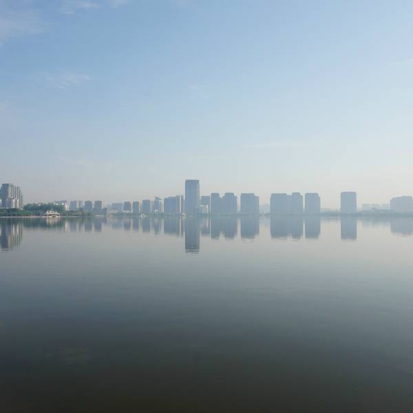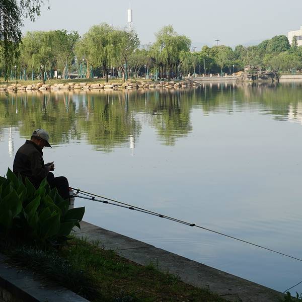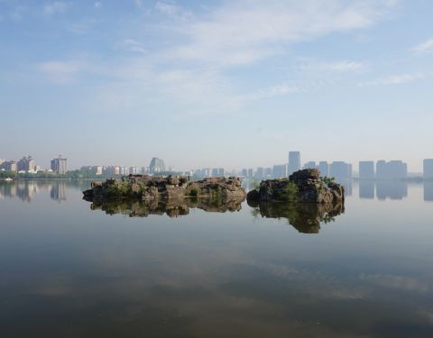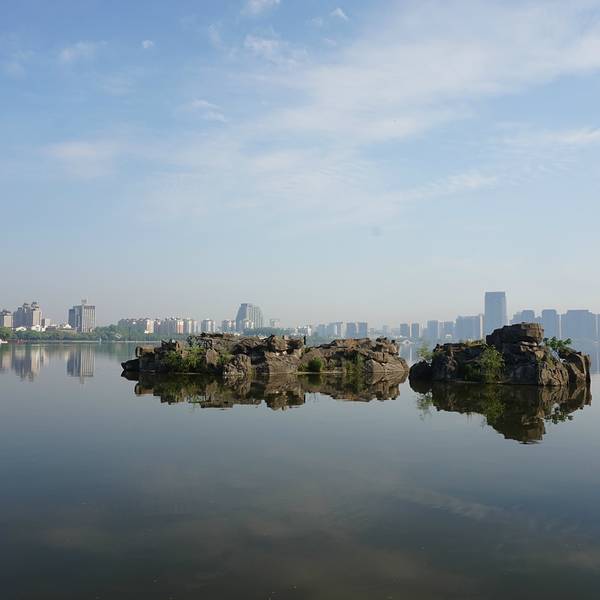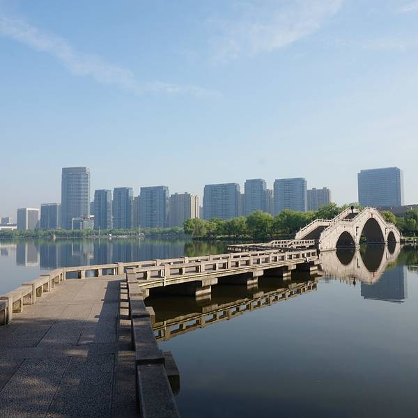 来到一个城市,我都会去感受这座城市早晨的魅力,绍兴的早晨很安静,我们所住的柯桥此时还没有商业的的气息,不妨可以去柯桥的瓜渚湖走走,和绍兴当地的市民一起享受绍兴早晨的这份宁静,从绍兴世贸君亭酒店到瓜渚湖大概1.5公里的距离,步行需要20分钟。瓜渚湖是绍兴的第三大湖,在瓜渚湖的周围分别是东岸公园、南岸公园、西岸公园和北岸公园。离我们酒店最近的入口是南岸公园,南岸公园和东岸公园是相通的,所以早晨去瓜渚湖公园走走,呼吸新鲜空气,欣赏瓜渚湖的湖景,心境会变得很平静,只有心境平下来了,才能去感受这座城市的魅力。瓜渚湖的水面面积有1.5平方公里,湖面非常平静,湖对岸的高楼大厦倒影在湖面上。南岸公园的沿岸建造了一条观景道,道路很平稳,一直通往瓜渚湖东岸公园,有些绍兴市民早晨会来瓜渚湖公园晨跑,这里景色宜人,环境优雅,的确是一个非常适合晨跑的地方。站在南岸公园的岸边,左侧是瓜渚湖的西岸公园。瓜渚湖的景观步行桥(鹊桥)就位于西岸公园,步行桥的桥面离湖面大概只有40厘米,远处看仿佛是和湖面平行的。瓜渚湖的东南面的湖中有着几块颇大的石头,由于瓜渚湖的湖面很平静,石头的倒影映入水中,蓝天白云的时候,不经意的看,会觉得石头悬浮在空中一般。连接南岸公园和东岸公园的是虹桥,夜里桥上的灯光会开启,很漂亮,站在桥上可以欣赏到瓜渚湖的全景。瓜渚湖公园内的植物面积很大,春夏天的时候景色格外的迷人,绿幽幽的一片,空气很清新,走在公园内仿佛是在“洗肺”,也难怪有些人喜欢在这里晨跑。东岸公园内也有一座步行桥,长度比西岸公园的短很多,桥的样式和西岸的步行桥倒有几分相似。