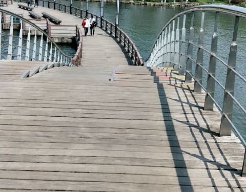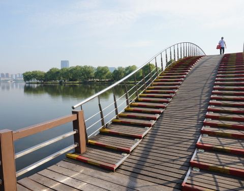 瓜渚湖是绍兴的第三大湖,在瓜渚湖的周围分别是东岸公园、南岸公园、西岸公园和北岸公园。离我们酒店最近的入口是南岸公园,南岸公园和东岸公园是相通的,早晨去瓜渚湖公园走走,呼吸新鲜空气,欣赏瓜渚湖的湖景,心境会变得很平静,只有心境平下来了,才能去感受这座城市的魅力。我去的是南岸公园,南岸公园的沿岸建造了一条观景道,道路很平稳,一直通往瓜渚湖东岸公园,有些绍兴市民早晨会来瓜渚湖公园晨跑,这里景色宜人,环境优雅,的确是一个非常适合晨跑的地方。站在南岸公园的岸边,左侧是瓜渚湖的西岸公园。瓜渚湖的景观步行桥(鹊桥)就位于西岸公园,步行桥的桥面离湖面大概只有40厘米,远处看仿佛是和湖面平行的。