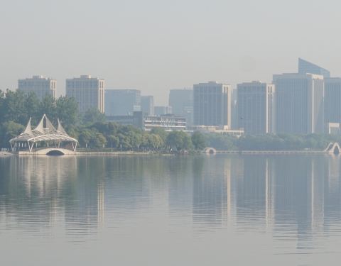 有些绍兴市民早晨会来瓜渚湖公园晨跑,这里景色宜人,环境优雅,的确是一个非常适合晨跑的地方