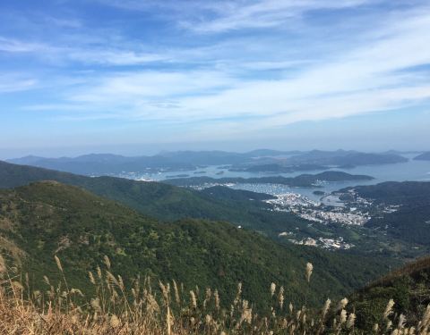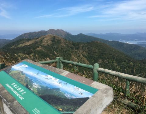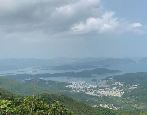 飞鹅山有上下两处观景台,离的并不远,中间隔着个亭子。海拔稍低一点的观景台,往西南方眺望可以看到九龙半岛,视野非常广阔,九龙半岛上的高楼大厦尽收眼底,再往左边看看,还能看到启德机场的旧跑道。 拾级而上,经过那个小亭子,来到海拔稍高一些的观景台,这里看出去就是西贡方向的大海了,艘艘游艇点缀在海湾里,若是天气再好一些,还能看到万宜水库。 飞鹅山观景台的背后,是九龙半岛延绵的山脉,狮子山、象山、大老山.....都等着我慢慢的去征服。