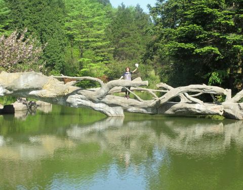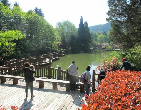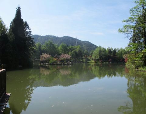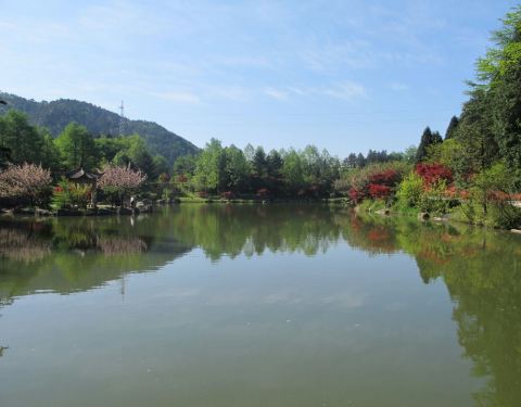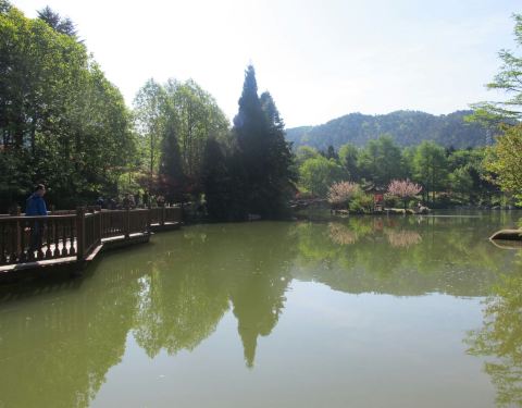 湖面不大,因是堰塞湖,在800米海拔上有这么个湖,也不容易。湖边绿化很好,人工建了座小桥可以走上去拍照。湖水不是很清,但在蔚蓝天空的辉印下,拍出照片的水面是蓝色的。围绕湖边走一圈,感觉有点小资!边上有个高级别墅型的宾馆,最好几户人家联合包下一栋,分摊下来也不算贵,可以自己做饭!