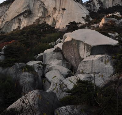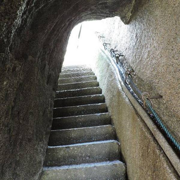 这里特别险要,易守难攻。建议上山从右侧较缓的山路登上,从这里下来还少费些力气