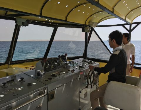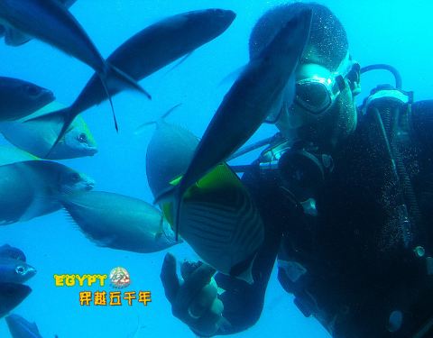 下潜!左满舵!全速前进!以前只有在电影里看到的情节,在埃及红海我也体验了一回!刚从导游手中拿到自费项目单时,我就直接在潜水艇项目上打了个勾,虽然它的价格不菲,110美元一位,孩子对折,但是这种体验机会难得哦!潜水艇不是从岸边码头开始登的,而是泊在红海深处的浮动码头,去那儿需要游艇摆渡!哈哈,还白坐一趟游艇,值!话说红海看上去风平浪静,可到浮动码头却是风大浪急!一度担心会不会有危险!等大家从顶舱门攀爬入艇内后,发现挺平静的!潜水艇四面全是舷窗,方便大家欣赏海底世界。两个埃及驾驶员放着流行音乐,摆动着身体,淡定悠闲地驾驶着潜艇。艇速不快,行进中可以看到鱼群在游戏,还有沉船,珊瑚礁,如同深潜一般,棒极了[强]一位潜水员会伴随着潜水艇游走,并抓一些小鱼喂食大鱼,与艇内乘客互动交流,令孩子们很兴奋!花上一美元小费,还可以到驾驶室体验一把,羡慕吧!