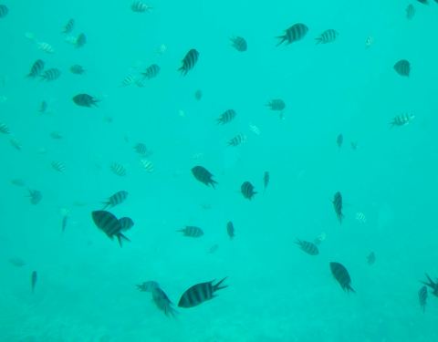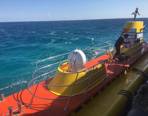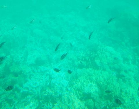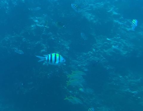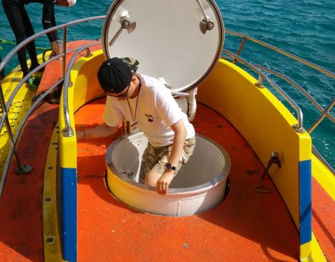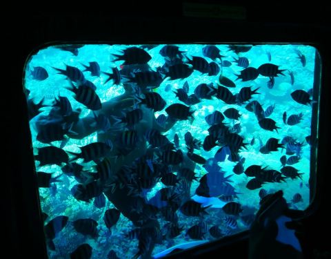 先坐约莫40分钟船,上甲板看了一会儿风景,无敌的蓝天碧海啊,但是海风太大了而且暴晒,坚持不了太久。到海中一个平台上换乘潜艇,从舷梯上下到内舱,游客分两排坐好,每人面前有一个小舷窗,去程的时候我们这边可以看到很多海底的珊瑚还有沉船什么的,回程的时候有潜水员拿着鱼食吸引来很多小鱼,看着潜水员在水中自如的和鱼儿们畅游,心里痒痒的,好想也再尝试一把深潜,但不知道耳朵的承压力会不会好点是不是还会疼~
