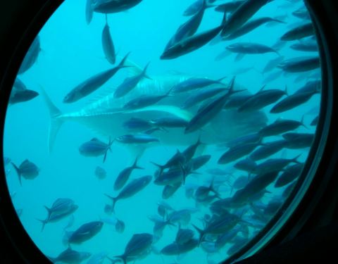 ...舷窗外给潜艇内的游人打着招呼,他一旦掏出鱼饵,附近大大小小的鱼就立即围拢过来享受美味,非常壮观