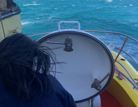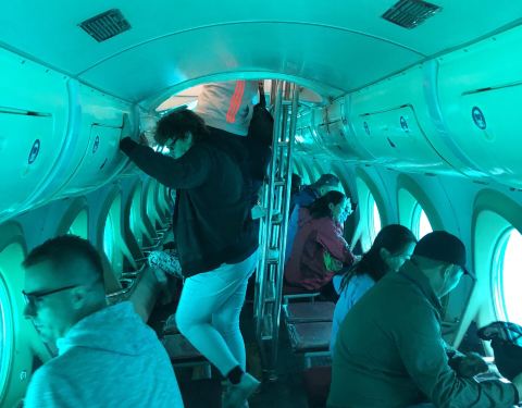 从舷梯上下到内舱,游客分两排坐好,每人面前有一个小舷窗,去程的时候我们这边可以看到很多海底的珊...