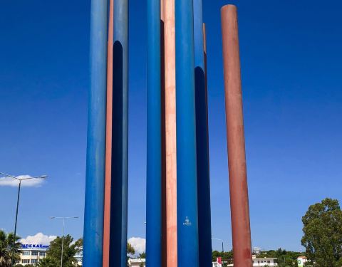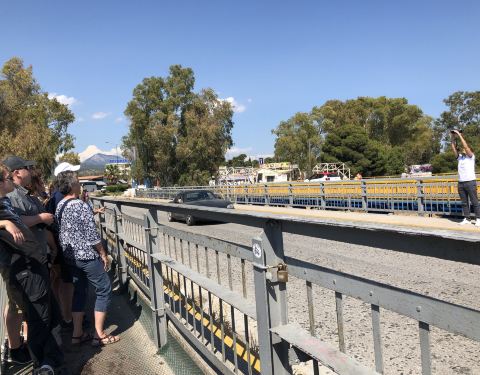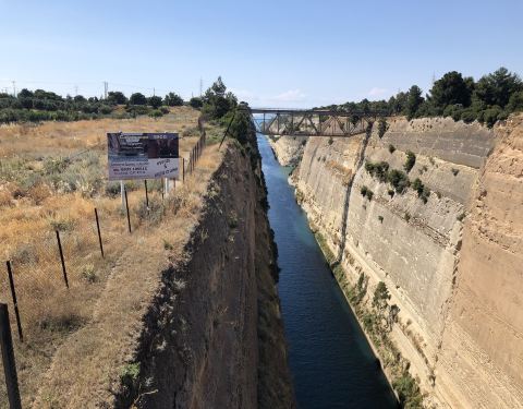 科林斯运河在希腊南部科林斯地峡上,是横穿希腊科林斯地峡的一条运河,连接科林斯湾和萨罗尼克湾,接通爱奥尼亚海和爱琴海,将伯罗奔尼撒半岛与希腊大陆分割开来,使得伯罗奔尼撒半岛实际上成为了一个岛。科林斯运河只有5.5千米长,但深度达79米,是世界上开凿最深的运河,并且是极少数在坚硬石区开凿出来的运河之一。 科林斯运河最吸引眼球的是两岸刀削般的岩壁,偶有游船驶过,我们先上了左边的桥,先走右边的就看到船了。河面很低,要想和河面合影,相机必须举得高高的。桥的下层还设有蹦极台,我们也看到了蹦极。据介绍以前会有游客在桥栏杆上挂锁,由于锁的重量会影响桥的安全性,已被取掉并禁止再挂,于是改为桥栏杆上这些像垃圾袋的系挂物了(最后一张图)。