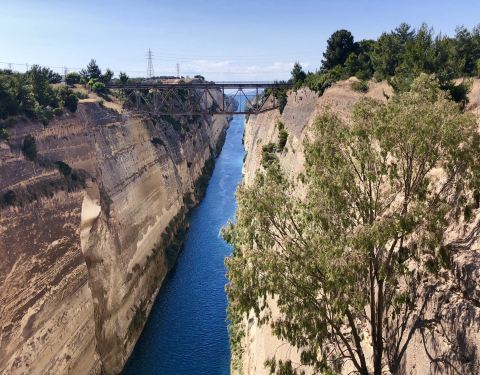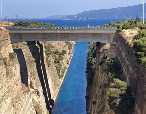 希腊的岛屿之行开启。第一站伯罗奔尼撒半岛の科林斯运河,它是雅典通往伯罗奔尼撒半岛の大门,也是爱琴海诸岛通往爱奥尼亚群岛及意大利的快捷方式,有欧洲巴拿马运河之称。