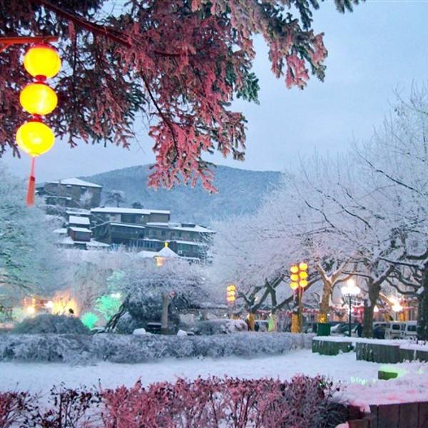 在临崖一面可凭栏眺望山坡上连绵成片、雪花盖顶的房屋,远处的山林也在云雾中若隐若现。不久,路灯也陆续点亮了,在温暖、彩色的灯光映照下,“雾凇”景观更显得梦幻迷离,其中一棵树上挂了许多大红灯笼,与白雪相映成趣、格外夺目,我仿佛进入了儿时梦中的童话王国,顿时童心复萌,兴奋得几乎要蹦起来了。