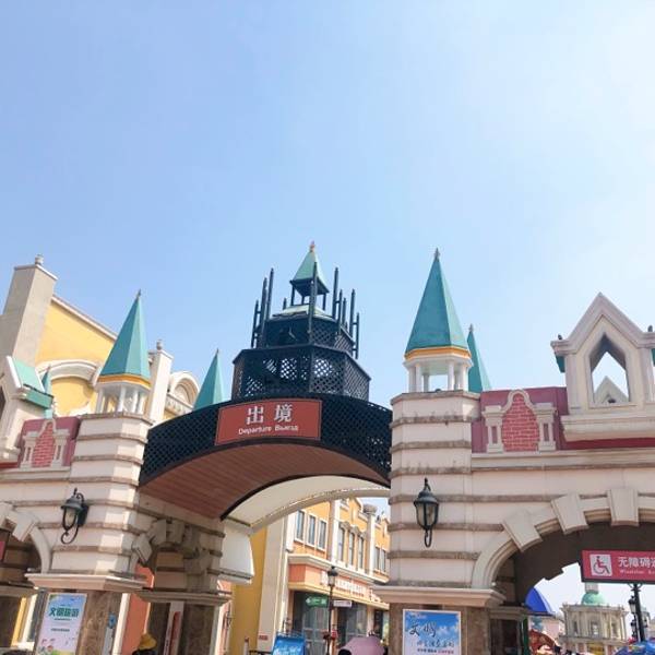 公园的进门处写的是『出境』 (出中国国境),进去走一段路,又写一个『入境』,然后就到了俄国风情街。为了配合这一主题,公园的门票采用的是 『护照』 的外观,标着引号的护照.