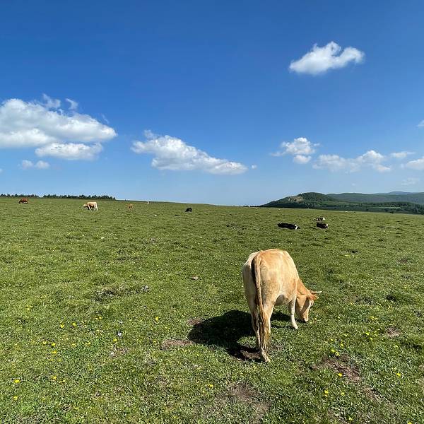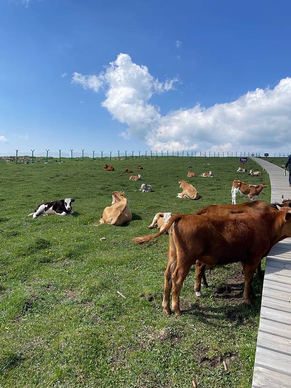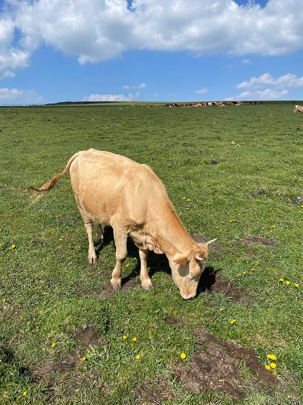 早上六点开车上的山,由于去的早没啥人,,工作人员考虑到安全和往草原去的路的艰险,统一让游客换乘了景交大巴车,自己的车放停车场,这样也好,开回25目前也不会,还安全省事一望无际蓝天草原结合的美可爱的牛...