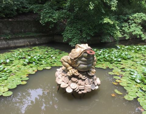 - 喜客泉景点小门进去,就可以看到左边有一池塘,塘里有一蟾蜍,嘴含铜钱,中间有圆孔,供游人投钱娱乐