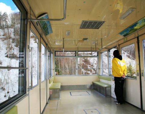 在层云峡坐缆车上黑岳五合目,缆车分成两段,要分别买票。上面那段是完全腾空的,没有踏脚扶手,比较吓人