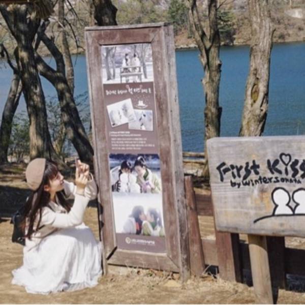 ❄️俊尚(裴勇俊饰)和惟珍(崔智友饰)初吻时坐的长椅。两人一起在木桌上堆的雪人,也被场景再现,成为南怡岛拍摄留念照片的地点之一。俊尚和惟珍在漫天大雪的南怡岛拍摄的海报,是每个来这里旅游的游客不可错过的合照地点。
