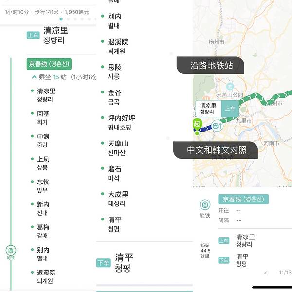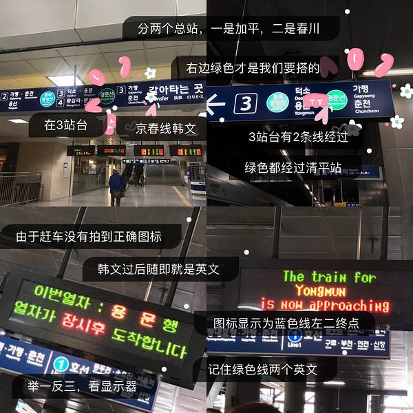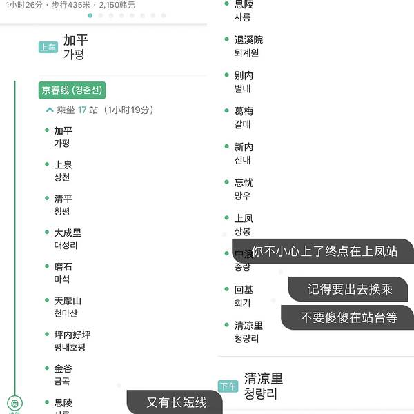 2️⃣换乘郊区地铁:乘坐京春线(此处都是韩文,记住绿色颜色牌子),乘坐1小时21分钟到达清平站,所处位置是清平驿「Cheongpyeong」