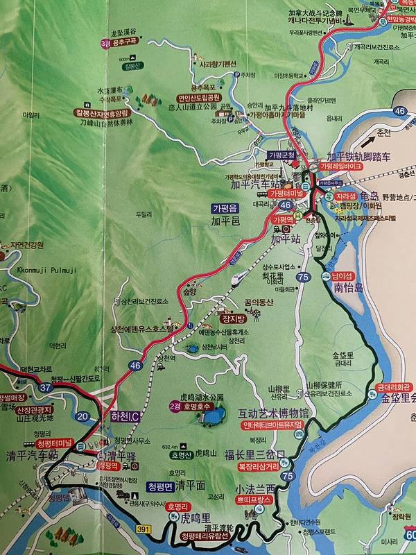 A:加平汽车站👉🏻加平驿👉🏻龟岛👉🏻加平铁轨脚踏车👉🏻南怡岛👉🏻金岱里会馆👉🏻互动艺术博物馆👉🏻福长里三岔口👉🏻小法兰西👉🏻虎鸣里👉🏻清平汽车站👉🏻清平驿👉🏻林草校前👉🏻晨静树木园