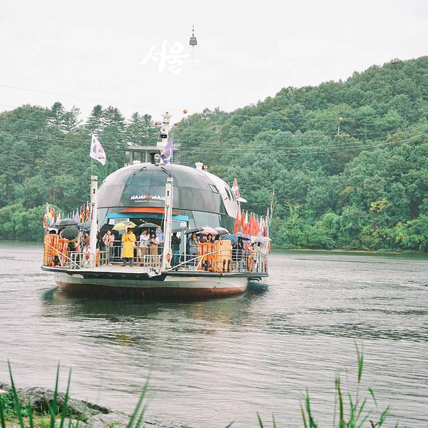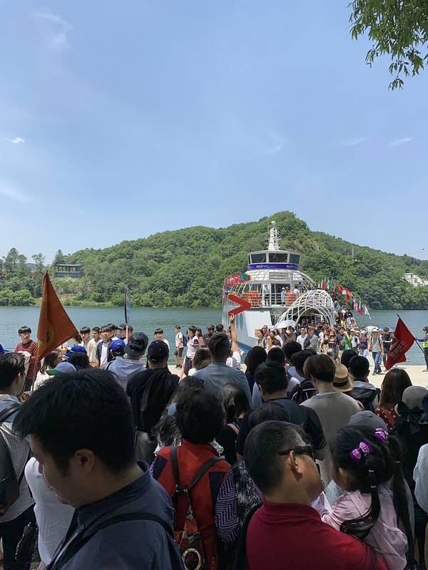 (原谅我,只能腼腆的偷拍到一个侧脸~~)下车后雨下得很大,休息片刻,顺便把没吃的早餐和午餐一并吞下。江里的一座小岛,上岛需要乘坐摆渡船,不过也就几分钟的船程便到了。南怡岛,一个光听名字就会觉得很美的地方。