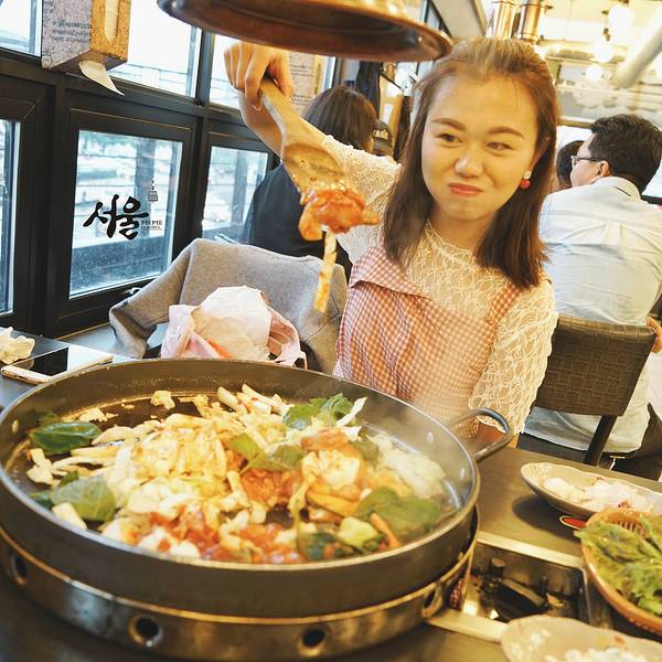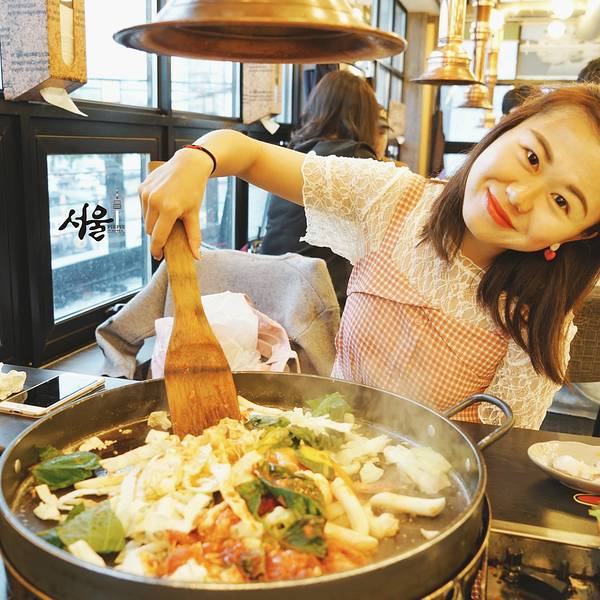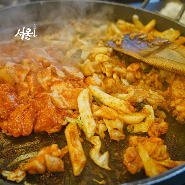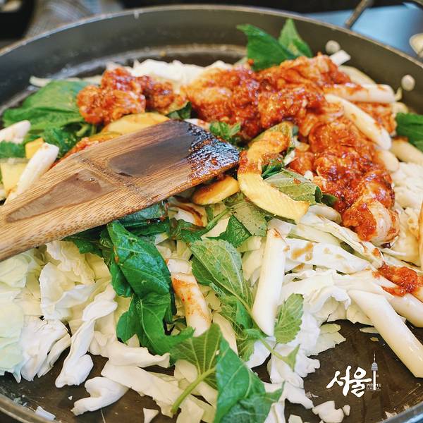 简单来说,就是将鸡腿和鸡胸肉加入辣酱的调料腌制一天,再混合白菜、洋葱、地瓜、洋葱、年糕等各种蔬菜,放到铁盘上炒。服务员建议我们点个两人份就足够了,待一切就位,风风火火的开始炒起来~~尴尬的是,还没开始吃,眼前这锅两人份的量就遭到了我们的白眼。