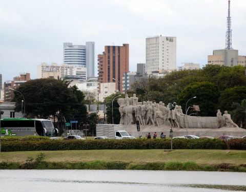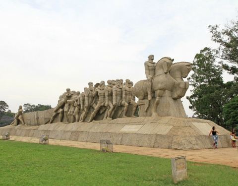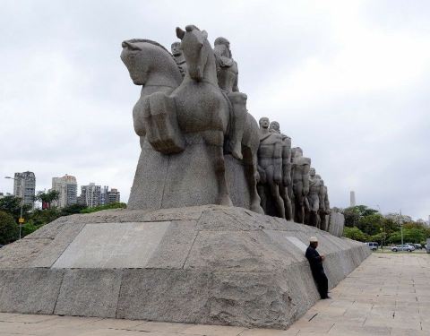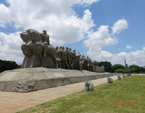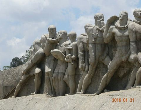 巴西拓荒者群雕是圣保罗著名的旅游景点之一。自从哥伦布于1492年10月12日发现了新大陆以后,西方殖民者纷至沓来。各种族的人们,在这里世代繁衍,为巴西乃至南美洲的发展做出了很大的贡献。为了纪念巴西发展的历史,突出不同国家、不同种族的人民对巴西的贡献,市政府塑造了这个群雕。 群雕由花岗岩雕刻而成,建在三层的花岗岩底座上。为首的,是两匹高头大马,马成奔驰状。骑马人,一人挺胸昂首,引领前进;一人回首看着队伍,似乎在喊着号指挥着人们。 马后是一群手持各种工具的开拓者,有老有少,有男有女,有各种面孔。第一排的是亚洲面孔,后面是欧洲面孔,有黑人,也有头戴白帽的中东人,还有怀抱婴儿的妇女。群雕的人物,形态各异,栩栩如生,把开拓者的寓意表现得淋漓尽致。