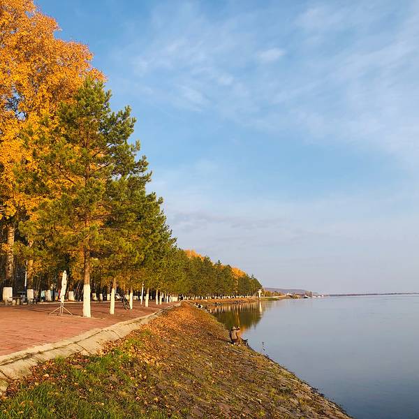 10月1日,一早在呼玛江畔公园欣赏了日出,吃过早饭游览了位于呼玛县城西边的画山风景区,景色非常不错,在黑龙江边,与俄罗斯隔岸相望,有木栈道,部分道路正在修建中……行程70公里,晚上我们一起举杯赏月,在庆祝伟大祖国生日之时也过了个团圆节!清晨的江畔公园,一轮红日在远山薄雾的映衬下缓缓升起,在黑龙江上留下了长长的靓丽的倒影……蓝天白云下的呼玛小镇给人一种温暖静谧的感觉……画山是黑龙江呼玛江段一个最为独特的美景,它临江依水,山岛一身,天造地设。景区为黑龙江畔的一山一岛,山据江壁立、陡峭挺拔,似刀切斧劈,山岩上五颜六色,远望如一幅挂在江边的油画。岛为半岛,占地100公顷。画山高307米,3处沟谷可攀登,南面缓坡可步行登山,山后有路可乘车到山顶,在山上可以观看黑龙江上下游20多公里的江段。岛上平整的牧草点缀着许多几十年树龄的柳树,一簇簇野玫瑰开着粉色、红色的小花,散发着阵阵花香。岛上还有两条水沟及几个水泡子,因黑龙江水位高时而通江,鱼可直接游入,是垂钓的好场所。岛的东南方是黑龙江的缓流和两公里长的浅沙滩,是天然的浴场。岛东一侧是杂树林,有山丁子、稠李子可供摘食,林地草丛中还产有草蘑、柳树蘑等。画山秋景很美,五彩斑斓的树叶散落在林间,山上树木茂盛层林尽染,山脉如刀劈斧砍连绵起伏,远处黑龙江水蜿蜒曲折流向天边,就像一幅隽美的油画……为庆祝伟大祖国的生日以及中秋节,大家包饺子,涮羊肉,吃月饼,举杯畅饮,度过了一个快乐的团圆节。晚饭后江边赏月赏景……