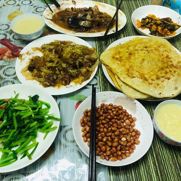 吃过早饭我们就去采购食材,不大的县城商店很多,买菜买肉也很方便,各种调料,活鱼鲜肉,新鲜蔬菜,大家各展身手,一桌节日盛宴很快准备完毕。相对简单的晚饭,主食肉饼