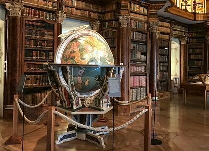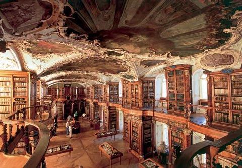 进入图书馆需要购票参观,在走廊上放置了一排排毛毡鞋,参观者需要套上鞋子,这是为了保护图书馆精美的花纹拼成的木板地。拖着步子走近图书馆的一刹那,也便就惊呆了。-数量巨大的书籍与美仑美奂的收藏室装饰,让人目瞪口呆,可惜图书馆不让拍照。