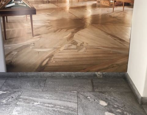 ...参观,在走廊上放置了一排排毛毡鞋,参观者需要套上鞋子,这是为了保护图书馆精美的花纹拼成的木板地