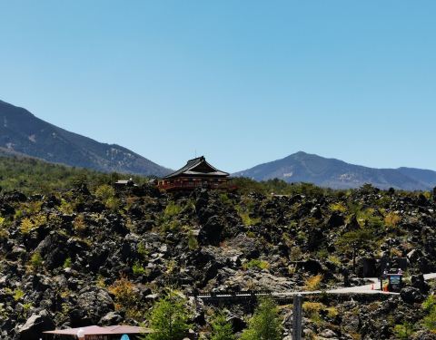 鬼押出园是天明3年浅间山所喷出的火山溶岩所形成,是宽为3公里,长为12公里的熔岩地带。此名称意为大火山口看起就像鬼推出来的一样,在熔岩台地的高台上有一观音堂为镇护,庇佑那些因浅间山喷火而亡的人们。游客可经由其步道。慢慢地欣赏造形特殊但却栩栩如生的各式奇石,宛如鬼斧神工美丽壮观。