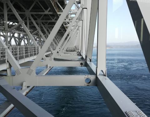 在鸣门大桥上为观光客修建的450米长的45米高的观光长廊,长廊的地上不时会出现一大块玻璃地板让游客观看脚下的海面,有恐高症者很难有勇气俯视。