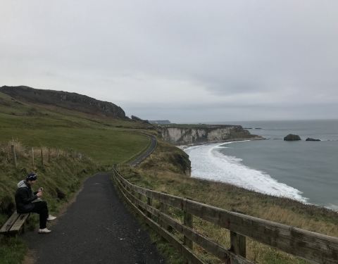 报的旅行团一路车往索桥和巨人之路的路上一侧就是蔚蓝的海岸线,有些时候甚至隔着岛屿还能看到苏格兰。整个海岸线的地貌也十分的崎岖,无数个转弯口都可以看到直接的悬崖峭壁,有种随时要掉下去的感觉 而有些路段甚至旁边还有火车道,可能坐火车这种贴着海和悬崖的感觉会更急刺激吧。