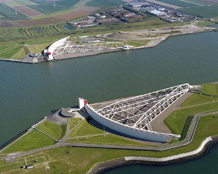 马仕朗防风暴大坝地位相当于中国的三峡大坝,堪称是世界上较大的水坝工程。大坝全长300多米。大坝设计的独特之处在于可移动。独特设计马仕朗防风暴大坝位于鹿特丹港口外,位于鹿特丹新航道的西端,全长300多米,高度大致相当于埃菲尔铁塔。大坝设计的独特之处在于它的两个球形转轴可以分别水平和垂直移动两个闸门,使大坝成为浮动在水面上的建筑。观赏大坝观赏大坝壮观景致的较佳位置是位于荷兰之角的游客中心。远远望去,设计现代的白色镂空结构构成了巨大的大坝闸门,可以看到一条条巨型万吨级货轮往返穿行于水中,繁忙而有序。
