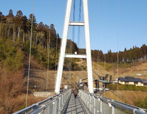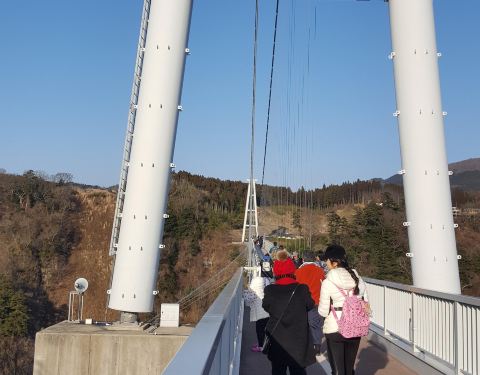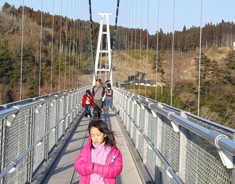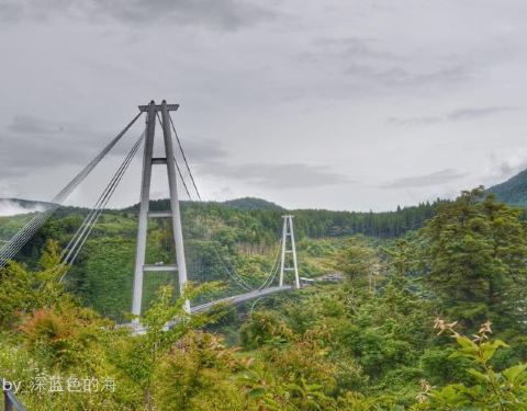 是日本最长的行人专用拉索桥,桥面中间是镂空的铁网,狠刺激吧。