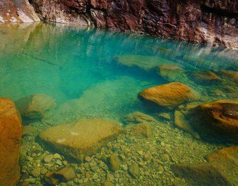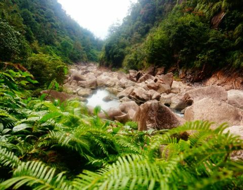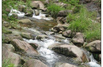 ...路均为巨石叠起,每块巨石被溪水长年冲刷无棱无角,也相对平坦,巨石之间偶有深潭,峡谷两侧均为峭壁