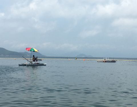 长洲岛虽然到处都环海,但是真正可以下海游泳的地方,就只有东湾和观音湾两个泳滩。其实这两个海滩是仅仅联系在一起的,中间就隔了长洲石刻和直升机坪。观音湾是很适合水上运动的,有独木舟和滑浪风帆这样的设施,在旁边还有烧烤场和简易沙滩排球场。